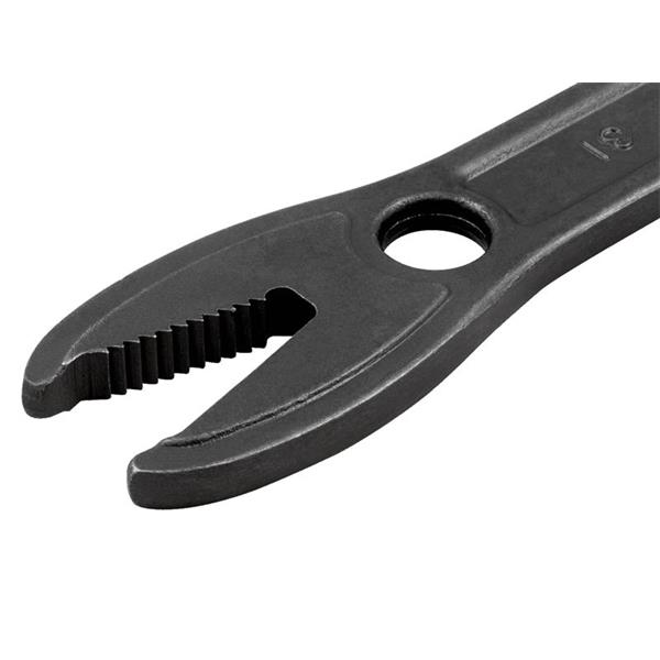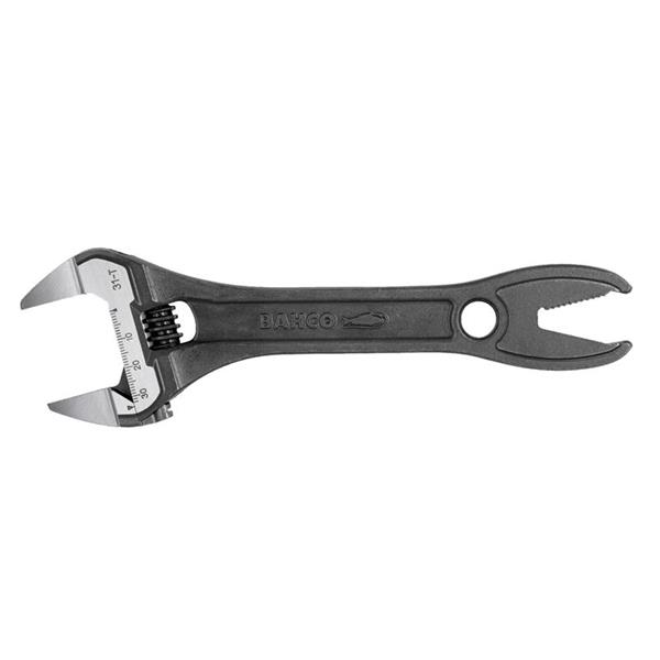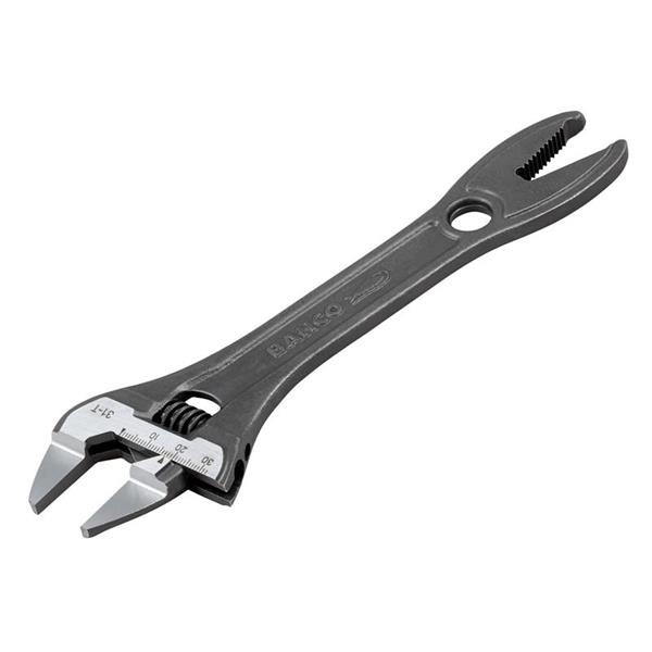 The Bahco 31-T Thin Jaw Adjustable Spanner has one open-end with serrated shark jaws for pipe fittings, loosening rounded nuts and bolts, working with round objects etc. It is equally strong in both directions. At the other end, there is an extra-wide jaw opening with a laser scale in mm for pre-adjusting and accurate measurement.