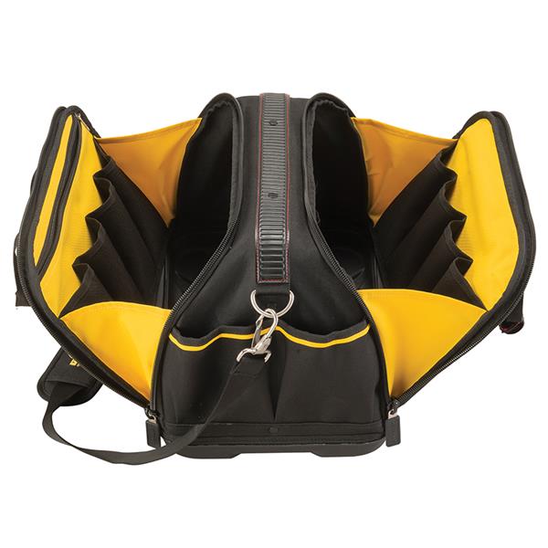 The Stanley FatMax® Multi Access Bag features dual side opening storage space, with two separate main wide opening compartments providing a large storage space for hand tools/power tools. It has a free-standing rigid structure with a reinforced plastic base to protect from water and dirt. There are multiple pockets for easy and convenient organisation of tools. Other features include a closed secure front pocket, padded shoulder strap and multiple internal and external pockets and loops.