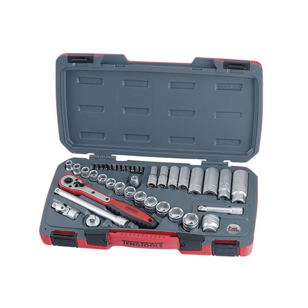This TENT3839 3/8 inch drive 6-point socket set comprises 39 pieces, which are supplied in a plastic case which has a click lock and folding handle.